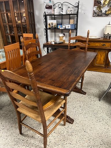 60"w 33"d 30.5h Wood trestle table w. 2 armless/2 armed